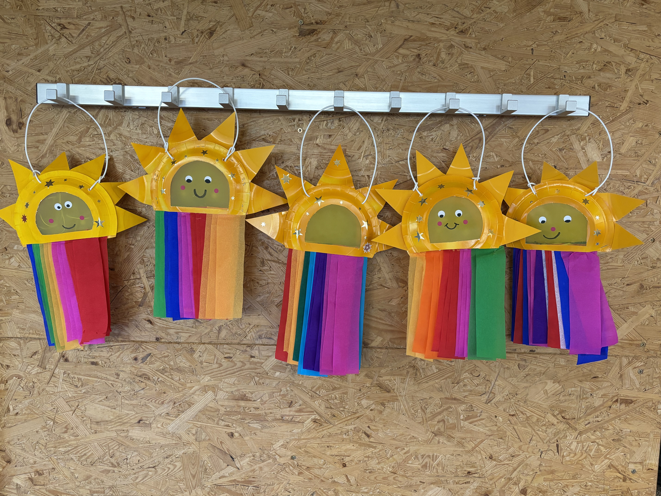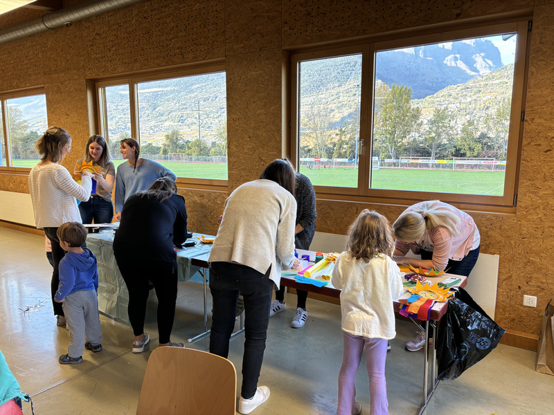 Wir trafen uns im Sportplatzsaal, um gemeinsam eine Laterne für St.Martin zu basteln. Die Vorlage einer Sonne mit Regenbogenstreifen konnten die Kinder selber gestalten und die Farben auswählen. Mit den Mamas zusammen wurde alles zugeschnitten, angekebt und verziert.