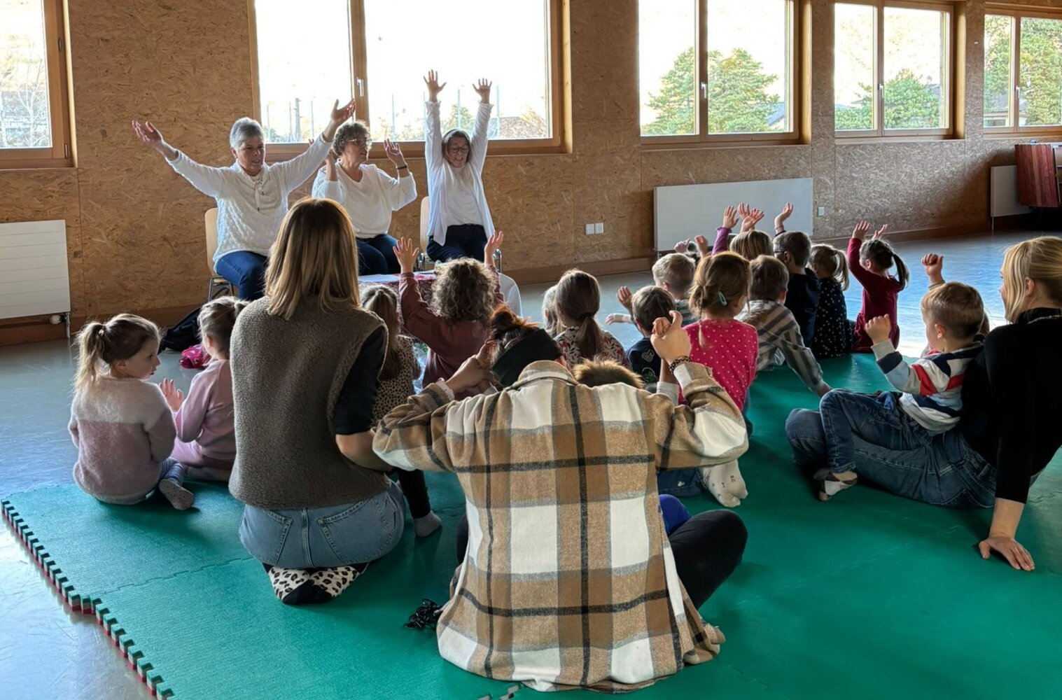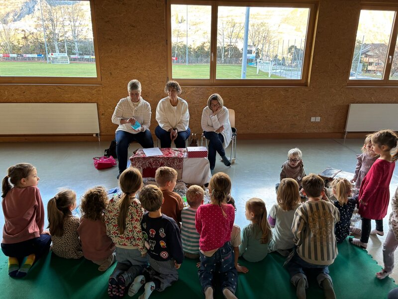 Die Märlitanten aus Agarn nahmen die Kinder mit ihren Geschichten mit in eine andere Welt. Mit ihrem Koffer und den liebevoll ausgewählten Utensilien wurde jede Erzählung lebendig: vom Schneemann Neo, vom Fuchs, der „Seich“ erzählt, und von einer Geschichte, nach der morgen sicher alle Kinder eine Mütze zur Schule anziehen werden.